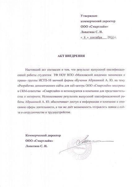 При написании дипломной работы мало у кого настолько много времени, желания и сил, чтобы взять да и составить акт о внедрении результатов дипломной работы.