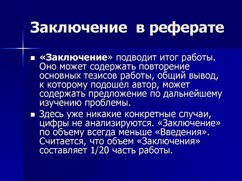 Объем заключительного раздела реферата не может быть больше, чем объем вступительной части. Вывод к реферату размещается на 1-3 страницах. Если говорить в процентном отношении ко всей работе, то для заключения отводится от 5 до 10 процентов. Не следует растягивать текст, вставляя фразы, не несущие смысловой нагрузки.