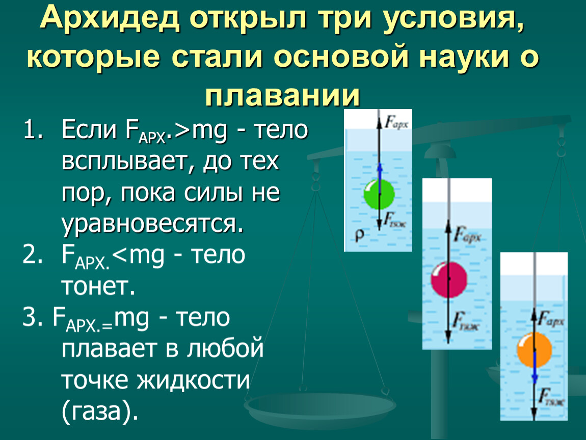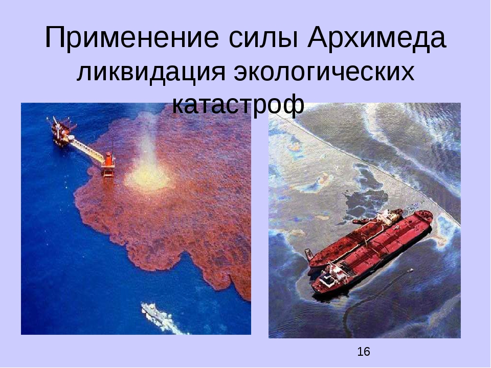 Газы диффундируют из его собственного тела в мочевой пузырь, делая его тело легче. Это позволяет рыбам подняться вверх. При спуске рыбы опорожняют свой мочевой пузырь, это увеличивает его плотность, и поэтому рыба тонет. 6. FLIP – Плавающая инструментальная платформа. Это исследовательское судно, которое исследует волны на глубокой воде. Он может поворачиваться горизонтально или вертикально. Когда вода закачивается в кормовые цистерны, корабль переворачивается вертикально. Принцип, который используется в FLIP, почти аналогичен подводным лодкам.Оба корабля закачивают воду в резервуар или из него, чтобы подниматься или опускаться.принцип Архимеда в предложении