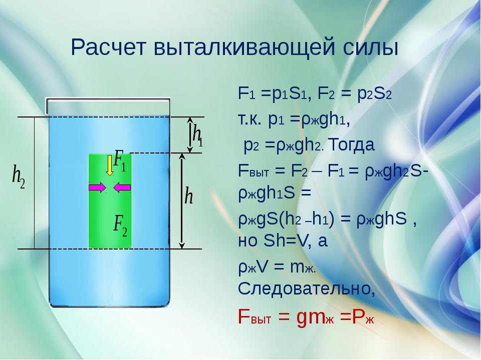 - выталкивающая сила, действующая на объект, равна весу вытесняемой им жидкости
