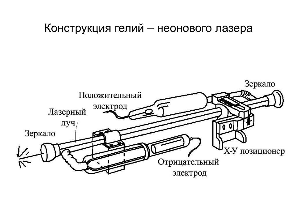 Накачка осуществляется по трех- или четырехуровневой схеме лазера. Например, типичным и наиболее используемым лазером на нейтральных атомах является гелий-неоновый лазер, в котором усиливающей средой служит плазма высокочастотного газового разряда, полученная в смеси гелия с неоном. На рис. 10 изображена упрощенная трехуровневая энергетическая диаграмма такого лазера.
