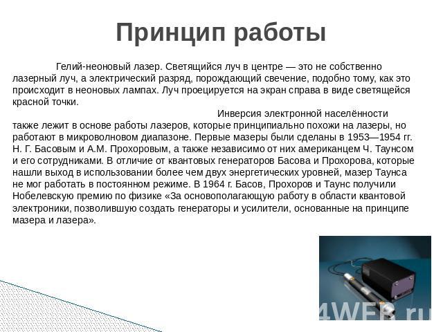 Лазер (от англ. light amplification by stimulated emission of radiation – усиление света посредством вынужденного излучения) он же оптический квантовый генератор – устройство, преобразующее внешнее воздействие (накачку), в энергию когерентного, монохроматического узконаправленного потока излучения.