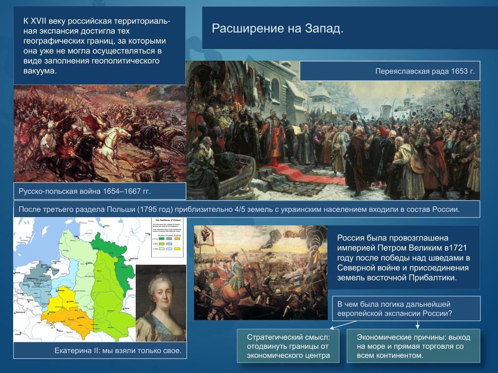 К тому времени, когда Петр Великий стал царем, Россия была самой большой страной в мире, простиравшейся от Балтийского моря до Тихого океана. Большая часть экспансии России произошла в 17 веке, кульминацией которой стало первое русское заселение Тихого океана в середине 17 века, отвоевание Киева и умиротворение сибирских племен. Однако