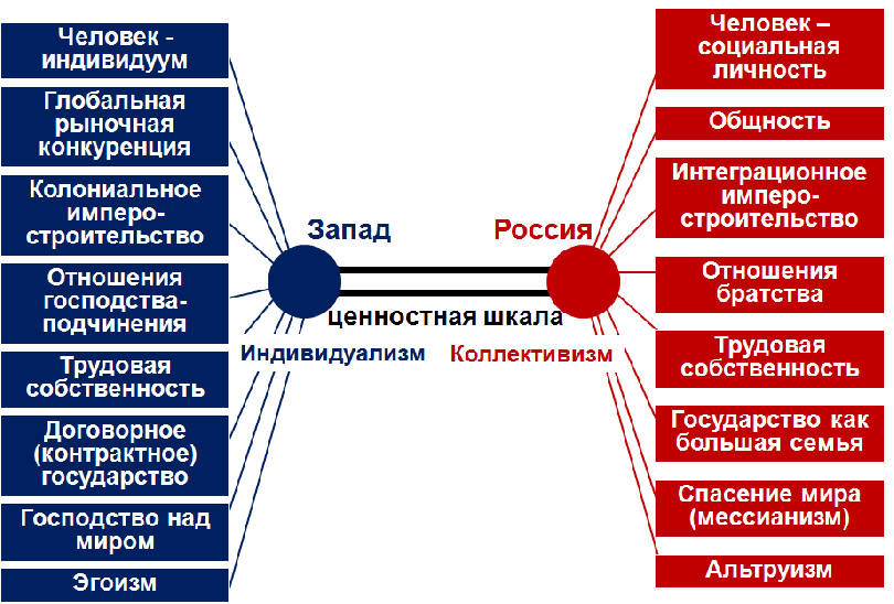 В отечественной культуре сегодня идет соединение несоединимых ценностей и ориентации – коллективизм, эгоизм, индивидуализм и соборность, политизированность, демонстративная аполитичность, государственность и анархия и др.