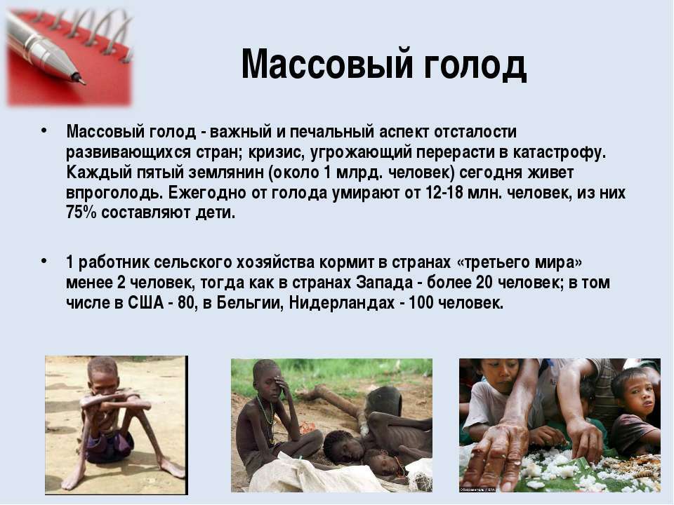 Если произвести несложные математические расчеты, то получится, что абсолютный недостаток продовольствия (по калорийности) ощущает каждый седьмой житель планеты. Свыше 5 млн. детей умирают каждый год из-за вынужденного голодания.