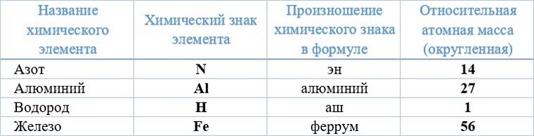 | Название элемента на русском | Название элемента на латинском | Символ элемента | Произношение символа |