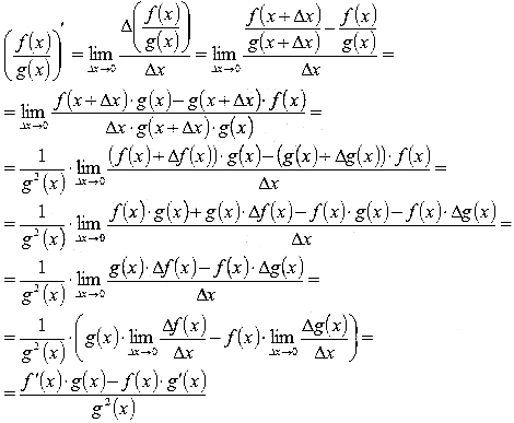 Производная частного двух дифференцируемых функций (при условии, что знаменатель не обращается в ноль) равна дроби, числитель которой представляет собой разность между произведением производной первой функции на вторую функцию и произведением первой функции на производную второй функции, а знаменатель равен квадрату знаменателя данной дроби.