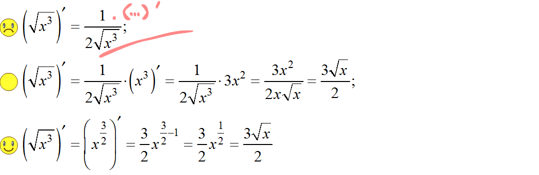 Если корень в знаменателе, сначала преобразовываем его в степень, затем — поднимаем наверх с отрицательным показателем, а далее — как обычно, производная степени.