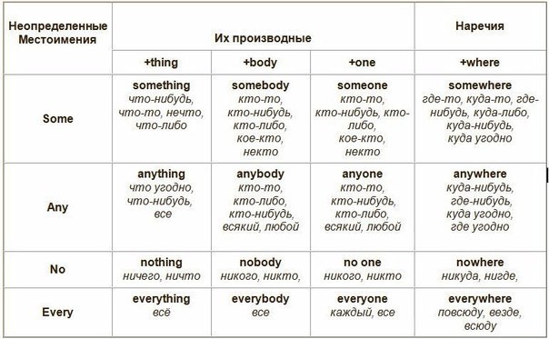 Any | anything что-нибудь, все, что угодно | anybody кто-то, кто-либо, кто-нибудь, всякий, любой | anyone кто-то, кто-либо, всякий, любой | anywhere где-нибудь, куда-нибудь, где угодно, куда угодно |