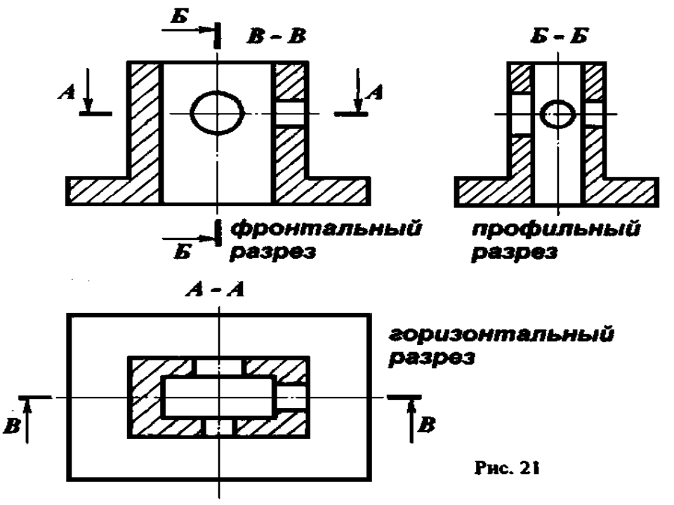 На разрезе показывается то, что получается в секущей плоскости и что расположено за ней, рис. 1(а). Направление взгляда здесь указано стрелкой. В результате внутреннее строение детали становится видимым. При этом линии невидимого контура (рис. 1,б) обводят линией видимого контура (рис. 1,в).