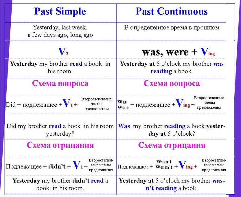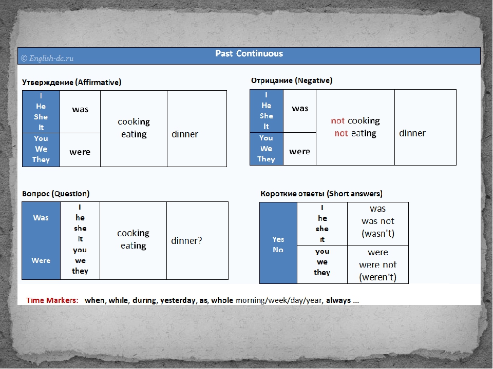 Это время для описания продолжительных или повторяющихся действий в прошлом. Was используется, когда подлежащее в единственном числе, were – во множественном. Например: