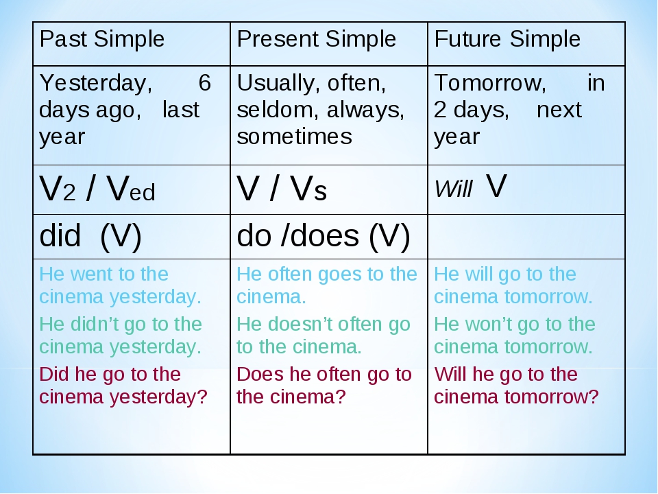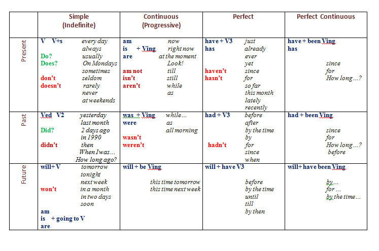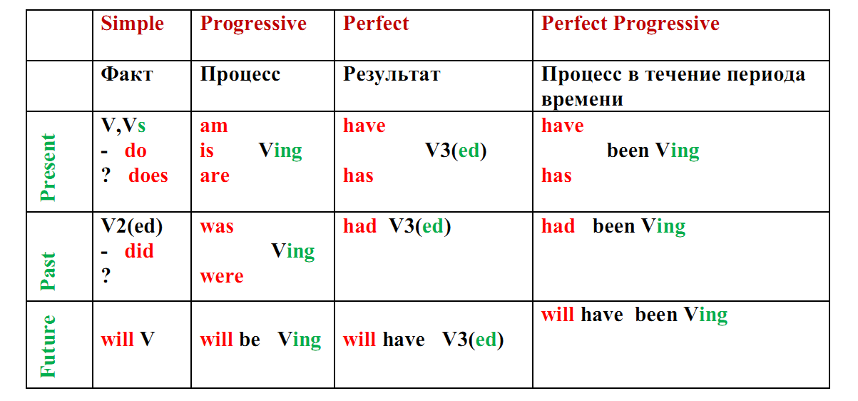 | Present (настоящее) | Past (прошедшее) | Future (будущее) | Future-in-the-Past (будущее в прошлом) | |