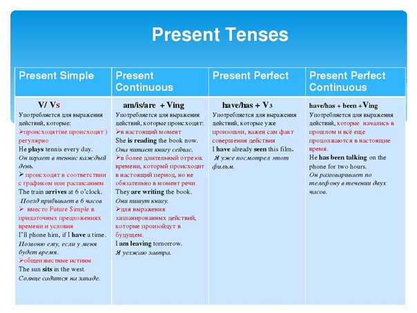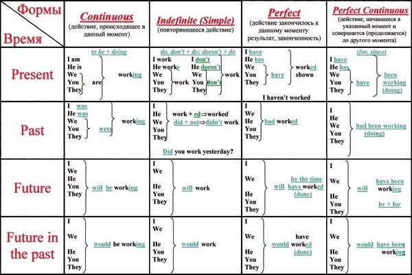 Кроме того, в английском есть так же Present Perfect Continuous, Past Perfect Continuous и Future Perfect Continuous. Если вкратце, то они используются для тех же целей, что времена Perfect Simple, но с акцентом на продолжительность. Посмотрим на примерах: