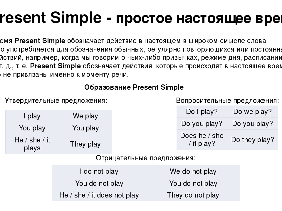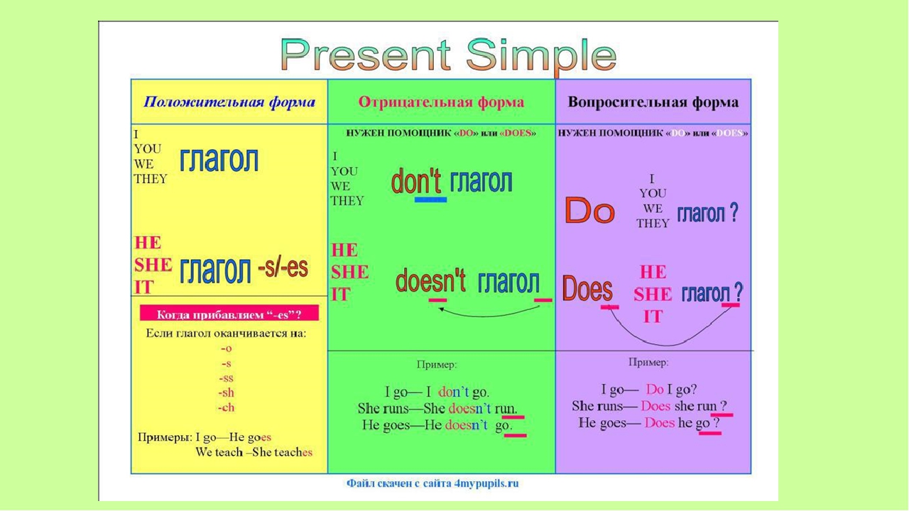 Применяется для действий, которые совершаются в настоящем времени на регулярной основе. Тут есть одна особенность: когда подлежащее стоит в третьем лице в единственном числе (he, she, it), то к глаголу прибавляется окончание -s. Например: