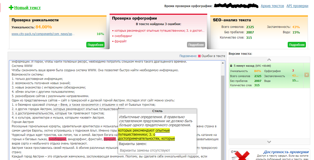 ΠΠ° Π½Π°ΡΠ΅ΠΌ ΡΠ΅ΡΠ²ΠΈΡΠ΅ Π²Ρ ΡΠΌΠΎΠΆΠ΅ΡΠ΅ Π½Π΅ ΡΠΎΠ»ΡΠΊΠΎ ΡΠ·Π½Π°ΡΡ ΡΠ½ΠΈΠΊΠ°Π»ΡΠ½ΠΎΡΡΡ ΡΠ΅ΠΊΡΡΠ°, Π½ΠΎ ΠΈ ΠΏΡΠΎΠ²Π΅ΡΠΈΡΡ Π΅Π³ΠΎ ΠΎΡΡΠΎΠ³ΡΠ°ΡΠΈΡ ΠΈ ΠΏΡΠ½ΠΊΡΡΠ°ΡΠΈΡ. ΠΡΠΈ ΠΏΡΠΎΠ²Π΅ΡΠΊΠ΅ ΡΠ΅ΠΊΡΡΠ° ΠΌΠΎΠΆΠ½ΠΎ ΡΠ°ΠΊ ΠΆΠ΅ Π»Π΅Π³ΠΊΠΎ ΠΈΠ·Π±Π°Π²ΠΈΡΡΡΡ ΠΈ ΠΎΡ ΠΎΠΏΠ΅ΡΠ°ΡΠΎΠΊ, ΠΊΠΎΡΠΎΡΡΠ΅ Π½Π΅ Π²ΡΠ΅Π³Π΄Π° Π·Π°ΠΌΠ΅ΡΠ½Ρ ΠΏΡΠΈ Π±ΡΡΡΡΠΎΠΌ Π½Π°Π±ΠΎΡΠ΅. ΠΡΠΈ ΠΈΡΠΏΠΎΠ»ΡΠ·ΠΎΠ²Π°Π½ΠΈΠΈ Π΄Π°Π½Π½ΠΎΠ³ΠΎ ΡΠ΅ΡΠ²ΠΈΡΠ° Π²Ρ Π±ΡΠ΄Π΅ΡΠ΅ ΡΠ²Π΅ΡΠ΅Π½Ρ Π² ΠΊΠ°ΡΠ΅ΡΡΠ²Π΅ ΡΠ΅ΠΊΡΡΠ°.