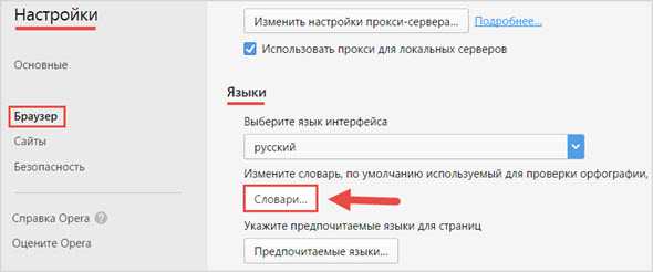 Для этого переходим в «Общие настройки» браузера, далее выбираем вкладку «Браузер», затем находим раздел «Языки» и кликаем по кнопке «Словари…».