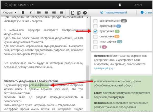 Проверка пунктуации работает аналогично. После отметки галочкой вновь подсвечиваются слова, которые попадают под выделение запятыми и вы приступаете к исправлению.
