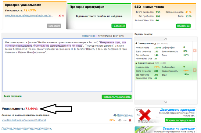 Перейдем к практической части статьи — проверим текст на уникальность. Для примера возьмем сервис Text.