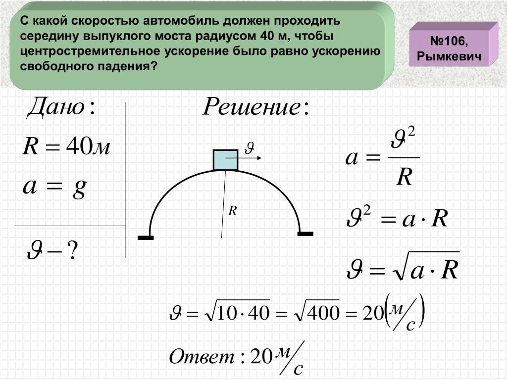 Скорость боба находится из a r = v 2 /r, v = (a r r) ½ .