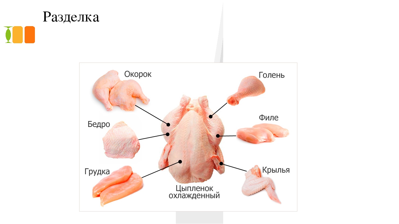 Место соединения ножки с туловищем надрезается. Ножка выворачивается из сустава и затем окончательно отделяется ножом от тела. - Отделение крыльев — плечевой сустав надрезают и после этого полностью отделяют крыло, немного оттянув его в сторону.
