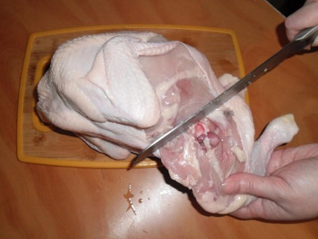 - 4. Ввести кухонный нож в тушку и не, торопясь, параллельно позвоночному столбу, разделить тушку пополам по направлению к себе.