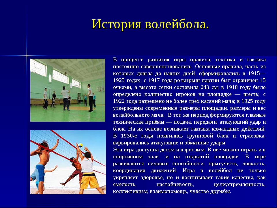У 1897 р.були розроблені спортивні правила цієї гри, які неодноразово змінювалися та доповнювалися. Проста гра, яка не потребує дорогого обладнання, дуже швидко поширилася в Японії, Китаї, на Філіппінах, а пізніше – в Європі. У нашій країні волейбол став розвиватися після Великого Жовтня.Отримавши велику популярність в Москві, він поширюється в РРФСР, на Україну, в Білорусії, Закавказзя. З 1933 р. проводяться першості СРСР серед збірних команд міст, а дещо пізніше – чемпіонати країни серед найсильніших команд добровільних спортивних товариств.Велике значення для розвитку дитячого волейболу мало відбулося в серпні 1935 р. Всесоюзне першість піонерів і школярів з волейболу.