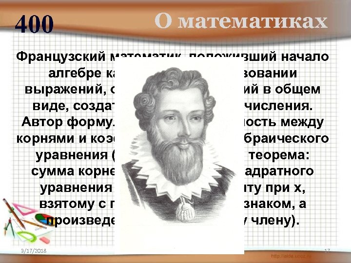 Он первым обозначил буквами величины, входящие в уравнения, и тем самым придал алгебре ту общность, которая является характерной чертой алгебраических исследований нового времени. Он также очень близко подошел к открытию биномиальной формулы, найденной позднее Ньютоном, и, наконец, в его трудах можно даже найти разложение отношения стороны квадрата, вписанного в окружность, к дуге окружности, выраженной в виде бесконечного произведения. Фламандец Альберт Жирар, или Жерар, чей трактат по алгебре появился в 1629 году, первым ввел в науку понятие мнимых величин. Англичанин Харриот показал, что каждое уравнение можно рассматривать как произведение некоторого числа факторов первого порядка, и ввел знаки > и