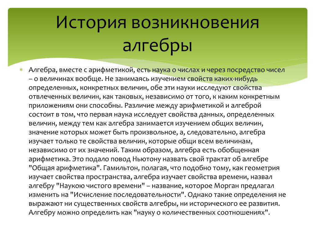 Алгебра, наряду с арифметикой, является наукой о числах и, через числа, о количествах вообще. Не изучая свойств каких-либо частных, конкретных величин, обе эти науки исследуют свойства абстрактных величин как таковых, независимо от того, на какие конкретные приложения они способны. Разница между арифметикой и алгеброй состоит в том, что первая наука изучает свойства данных, определенных величин, в то время как алгебра изучает общие величины, значение которых может быть произвольным, и, следовательно, алгебра изучает только те свойства величин, которые являются общими для всех величин, независимо от их значений. Таким образом, алгебра-это обобщенная арифметика. Это заставило Ньютона назвать свой трактат по алгебре “Общей арифметикой”. Гамильтон, полагая, что так же, как геометрия изучает свойства пространства, алгебра изучает свойства времени, назвал алгебру “Наукой о чистом времени” – название, которое Морган предложил изменить на “Исчисление последовательности”.