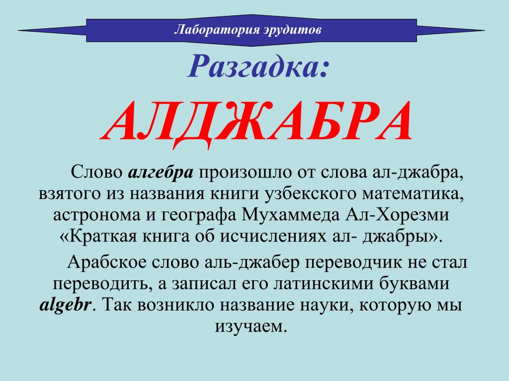 Происхождение самого слова “алгебра” не совсем ясно. По мнению большинства исследователей, слово “алгебра” происходит от названия работы арабского математика аль-Хорезми (от названия которого, по мнению большинства исследователей, происходит популярное слово “алгоритм”) “аль-Джабр аль-мукабала”, то есть “учение о перестановках, соотношениях и решениях”, но некоторые авторы производят слово “алгебра” от имени математики ГЕБЕРА, но само существование такой математики подлежит сомнению.