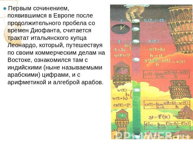 Первым произведением, появившимся в Европе после долгого перерыва со времен Диофанта, считается трактат итальянского купца Леонардо, который, путешествуя по своим торговым делам на Восток, познакомился там с индийскими (ныне называемыми арабскими) числами, а также с арифметикой и алгеброй арабов.