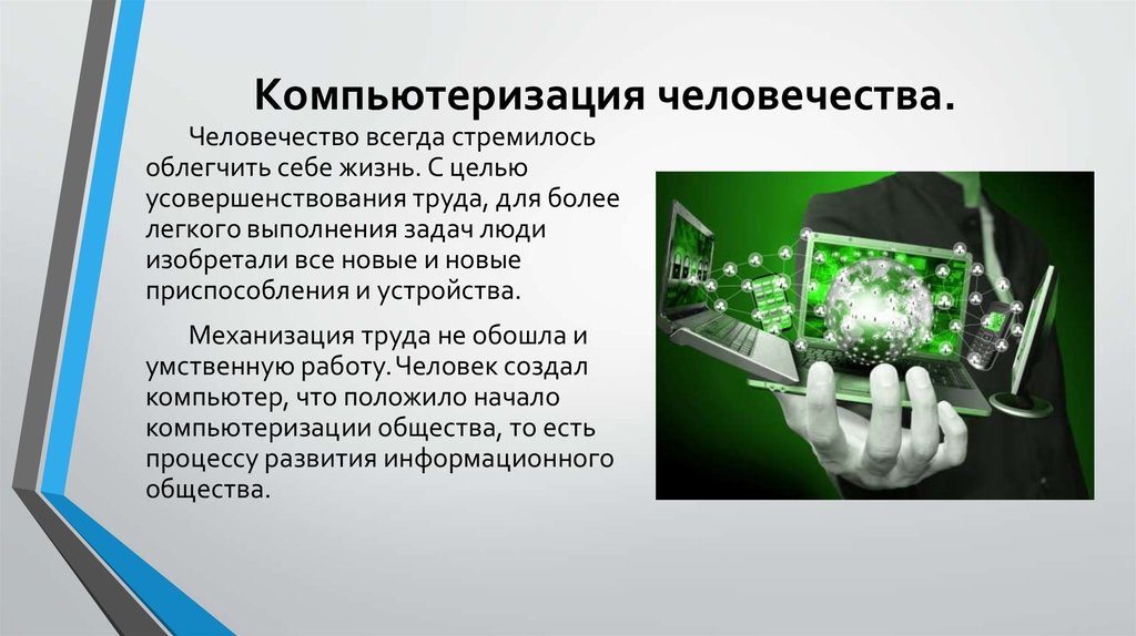 Сегодня темпы компьютеризации превосходят темпы всех других отраслей. Без компьютеров и компьютерных сетей не может быть средних компаний, не говоря уже о крупных корпорациях. Современные люди постоянно взаимодействуют с компьютерами — на работе, дома, в машине и даже на самолетах. Компьютеры быстро вторгаются в человеческую жизнь и занимают свое место в нашем сознании.
