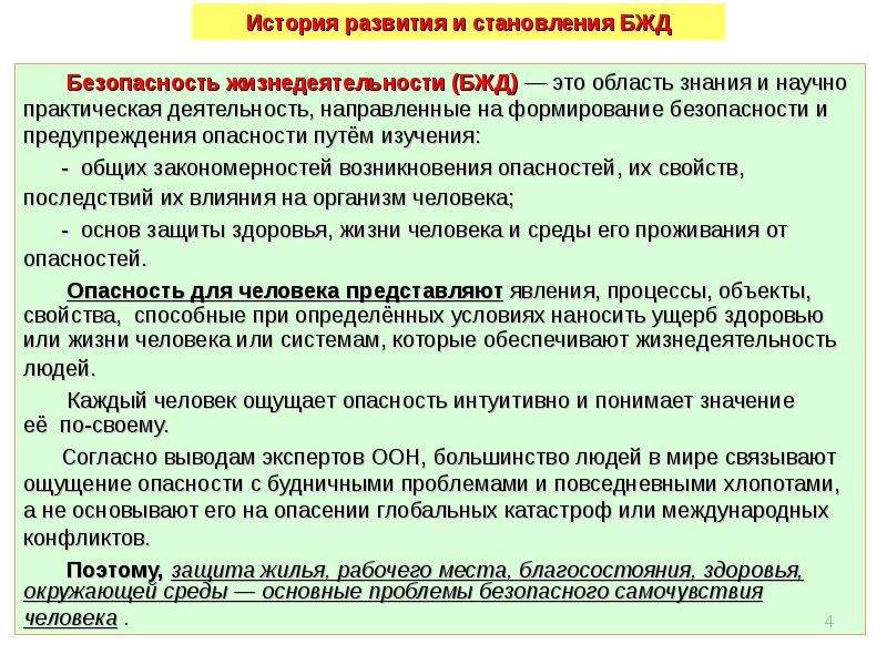 Обеспечение безопасности и здоровья человека, особенно подрастающего поколения, должно быть главной целью любого общества. Для целенаправленной подготовки обучающихся к поведению в возможных опасных ситуациях введены дисциплины «Основы безопасности жизнедеятельности» (ОБЖ) в общеобразовательных учреждениях и «Безопасность жизнедеятельности» (БЖД) в средних и высших учебных заведениях.