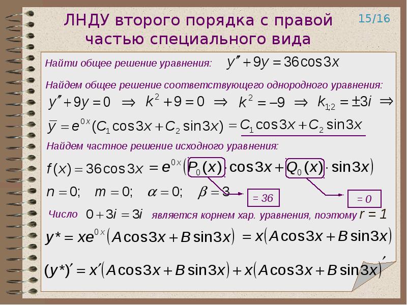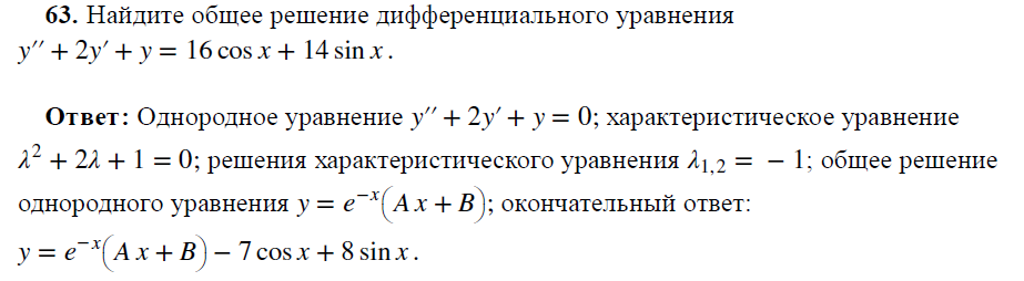 Wolfram|Alpha позволяет также получать решения дифференциальных уравнений второго и высших порядков. Например, так выглядит решение линейного неоднородного дифференциального уравнения второго порядка с постоянными коэффициентами: