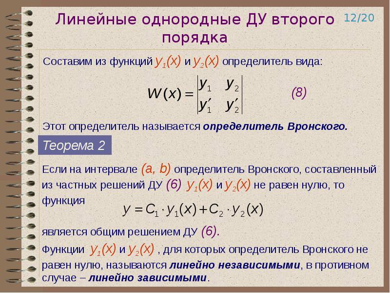 Второе слагаемое в (7) равно нулю, так как функции y j , j=1,2,..,n, являются решениями соответствующего однородного уравнения L(y)=0. Объединяя с предыдущим, получаем систему алгебраических уравнений для нахождения функций C” j (x)