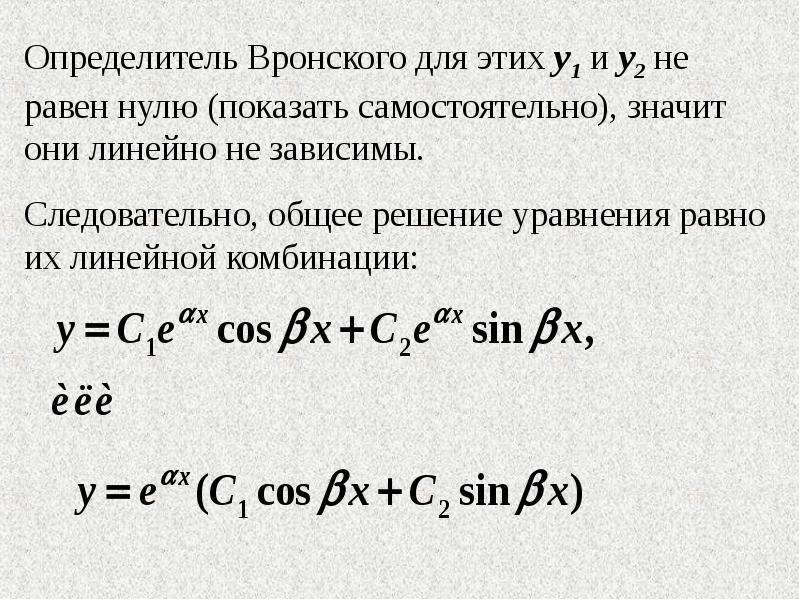 Определитель этой системы есть определитель Вронского фундаментальной системы решений y 1 ,y 2 ,..,y n соответствующего однородного уравнения L(y)=0 и поэтому не равен нулю. Следовательно, существует единственное решение системы (8).
