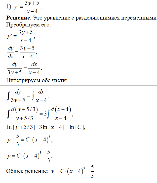 1) Решаем однородное уравнение y’+y/x=0. Это уравнение с разделяющимися переменными. Представляем y’=dy/dx, подставляем: dy/dx+y/x=0, dy/dx=-y/x. Обе части уравнения умножаем на dx и делим на xy≠0: dy/y=-dx/x. Интегрируем: