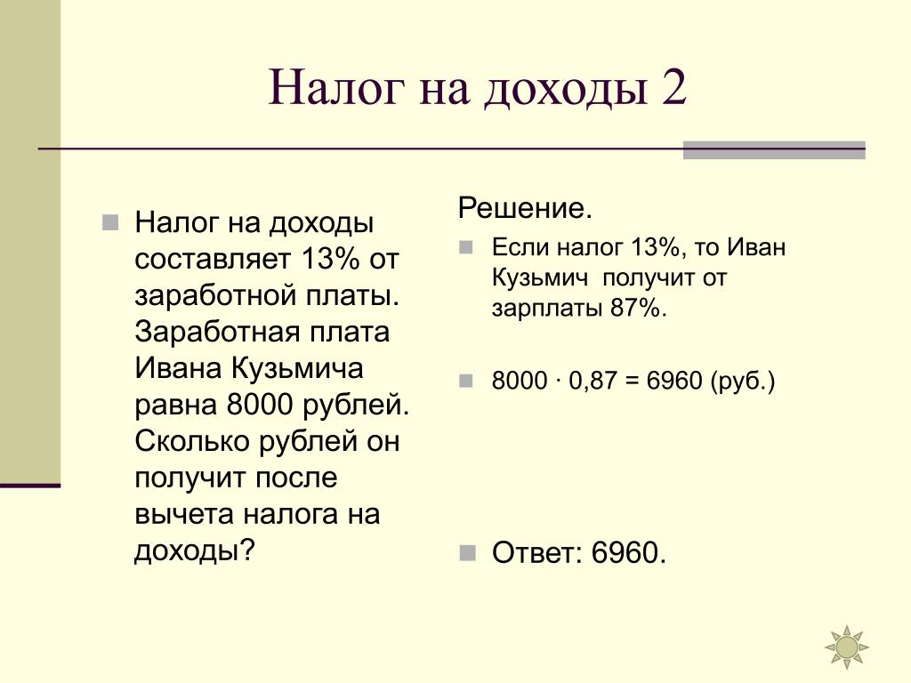 | Доход | Налоговая ставка | Величина налога | Совокупный налог |
