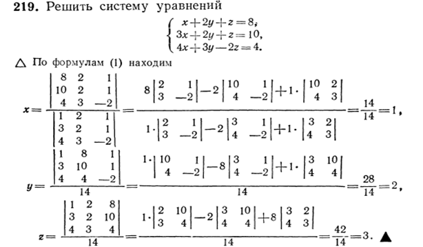 $$ {\left\{ \begin{array}{c} x = \frac{\Delta_x}{\Delta} \\ y = \frac{\Delta_y}{\Delta} \\ z = \frac{\Delta_z}{\Delta} \end{array} \right.} $$