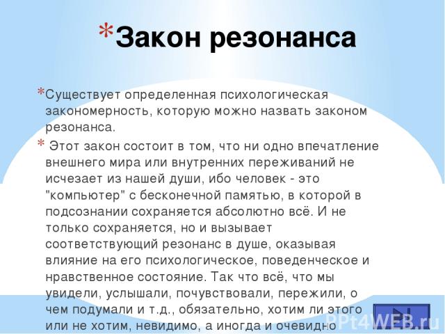 1. Если к вам пристал хулиган на улице или ваша семейная жизнь состоит из истерик и скандалов, осознайте – это резонанс, который вы создали своим состоянием. Стоит ли обижаться и обвинять кого-то в том, что вы сами притянули в свою жизнь. Может быть, обиды и обвинения дают какое-то утешение, но ситуацию они точно не меняют. А вот если вы обнаружите в себе источник неприятностей: страх или агрессию, которые притянули хулигана, собственную стервозность или обидчивость, у вас есть шанс измениться и тем самым изменить свою жизнь. 2. Понимание резонансного мира делает человека очень внимательным и чутким. Он видит в каждом мелком и как будто не значимом событии Те самые, которые не имеют логической причины, но действуют на сто процентов.