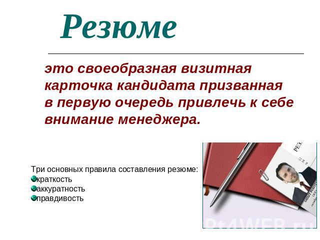 Резюме — документ, содержащий информацию о навыках, опыте работы, образовании и другой относящейся к делу информации, обычно требуемый при рассмотрении кандидатуры человека для найма на работу. Шанс произвести впечатление, у резюме есть только во время его первого прочтения, поэтому так важно правильно его составить. Составляя резюме необходимо делать акцент на те стороны личности, образования и трудовой деятельности, которые подходят под конкретную вакансию и конкретного человека. Именно по этой причине нет единого шаблона резюме. Для кадрового специалиста, резюме – это отличная возможность «прочесть» кандидата еще до собеседования. Причем источником информации порой служат как стиль оформления резюме, так и умение правильно преподносить информацию о себе. Конечно, для работодателя важную роль играет опыт работы кандидата, но не следует полагаться только на него, особенно в рамках жесткой конкуренции за место.