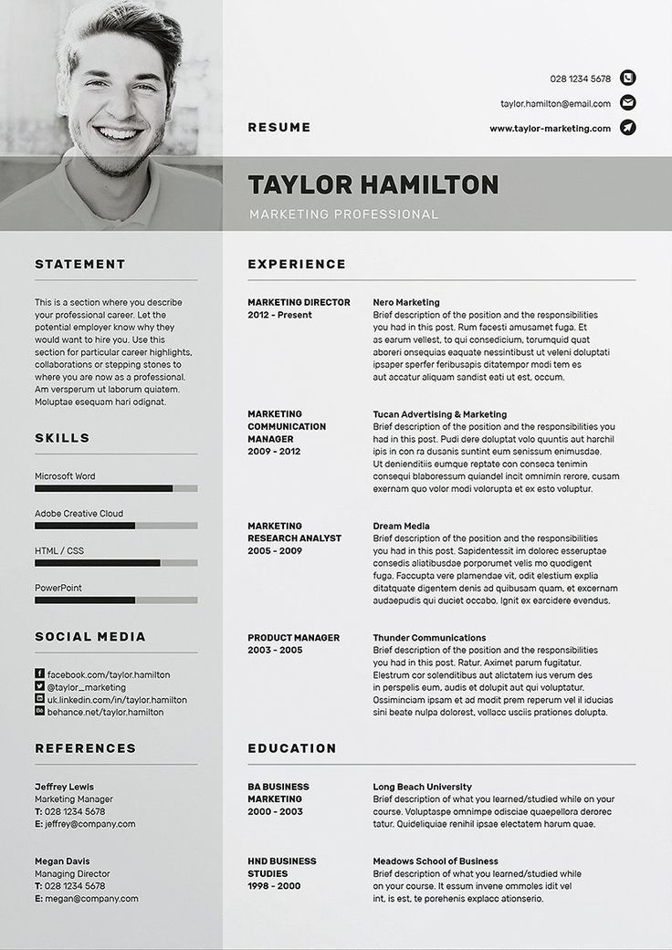 Этот современный макет очень похож на предыдущий. Основные отличия заключаются в выделенных жирным шрифтом прямоугольниках вверху и внизу документа. Это простое дополнение оказывает огромное визуальное воздействие. Этот формат резюме с фото отлично подходит для уверенных в себе кандидатов, которые хотят быстро привлечь внимание рекрутера.