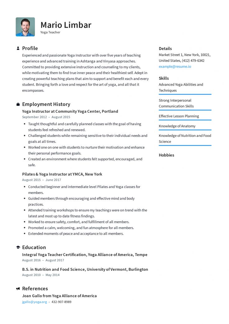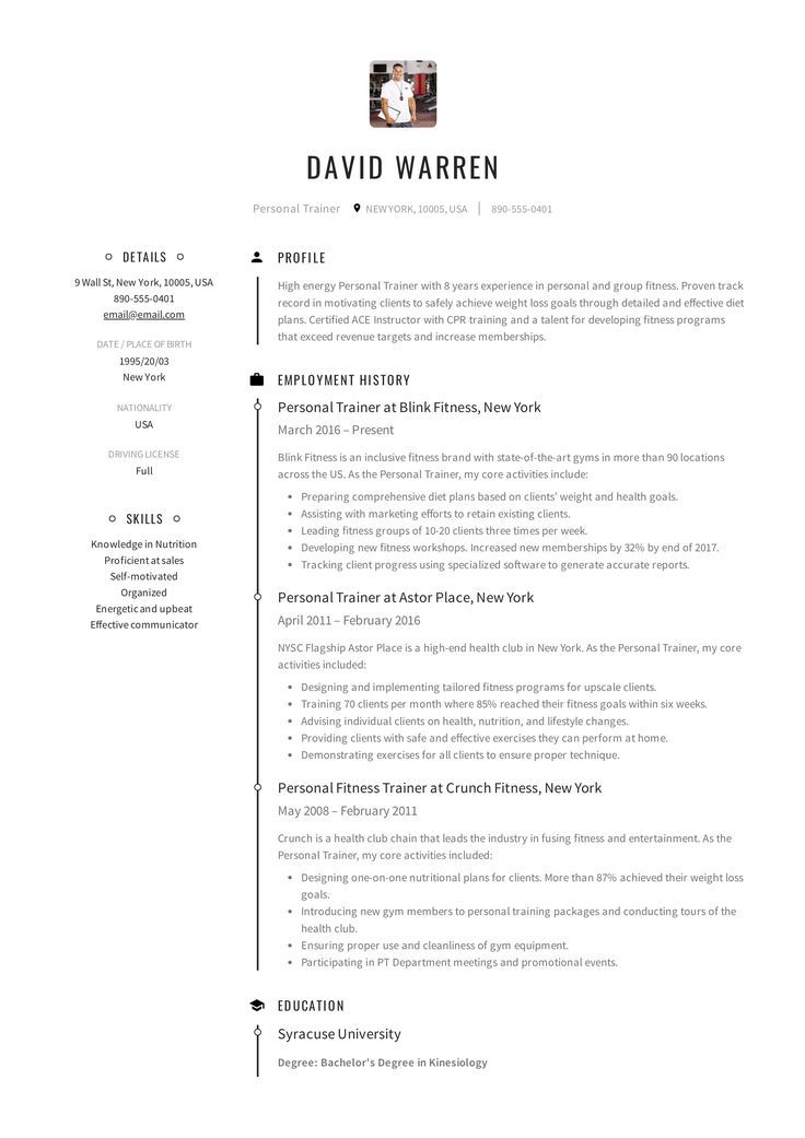 , Resume.io — это ресурс для соискателей любого уровня опыта и во всех отраслях. Это руководство и соответствующий пример резюме спортивного тренера покажут вам, как: Информационный бюллетень Elevator Pitch Раз в 2 недели наши эксперты собирают лучшие советы по карьере и резюме, которые вы можете прочитать за 15 минут или меньше. Регистрируясь, вы соглашаетесь с нашими Условиями обслуживания и Политикой конфиденциальности. Следите за своим почтовым ящиком! Наш информационный бюллетень уже в пути. Лучшие резюме и советы по трудоустройству от наших специалистов по карьере теперь будут приходить на ваш почтовый ящик каждые 2 недели! Спортивный тренер — это специалист в области спорта и фитнеса, который работает со спортсменами для лечения и предотвращения травм. Спортивные тренеры могут работать в фитнес-центрах, спортивных организациях, школах или заниматься частной практикой. Спортивные тренеры часто работают вместе с врачами и тренерами над разработкой программ, отвечающих физическим потребностям клиентов. Совет эксперта Как спортивный тренер, бизнес процветает. Бюро трудовой статистики США прогнозирует, что эта профессия вырастет на колоссальные 23 процента в течение десятилетия. Для сравнения, средний рост числа рабочих мест для всех профессий составляет около 4%. Средняя зарплата на этой должности составляет 49 860 долларов. Прежде чем приступить к составлению отличного резюме спортивного тренера, вам нужно взглянуть на каждый раздел, который входит в него. Резюме успешного спортивного тренера должно четко отражать способность кандидата создавать и реализовывать успешные программы спортивной подготовки для клиентов. Ваша способность оценить потребности клиента и разработать индивидуальную программу должна быть подчеркнута. Впечатляющее резюме спортивного тренера привлекает внимание к техническим знаниям кандидата, таким как его понимание упражнений по спортивной реабилитации и методов физической подготовки. Ваше резюме должно демонстрировать опыт работы, связанный с выполнением лечебных упражнений и реабилитационных методик. Спортивные тренеры должны сообщить о своих знаниях в области анатомии, физиологии упражнений, профилактических фитнес-стратегий и питания. Совет эксперта При приеме на работу в крупные организации или компании вы, скорее всего, столкнетесь с ATS, используемой на многих онлайн-порталах приложений. Для спортивных тренеров с некоторым опытом работы лучше всего подходит формат резюме в обратном хронологическом порядке. Этот формат начинается с вашего последнего места работы и работает в обратном направлении за последние 10 лет (или столько, сколько у вас есть). Однако это не единственный формат, который может работать. Гибридный формат начинается с раздела «Навыки» или «Опыт», за которым следует более короткий трудовой стаж. Это возможный выбор для недавних выпускников, личных тренеров и других лиц с нетрадиционными карьерными путями. Резюме резюме содержит 3-5 предложений, чтобы дать представление о ваших самых больших достижениях и качествах, прежде чем менеджер по найму прочитает остальную часть резюме. Поскольку спортивным тренерам требуется достаточное количество навыков работы с людьми, а также отраслевые знания, вы также захотите продемонстрировать здесь свою человеческую сторону. 