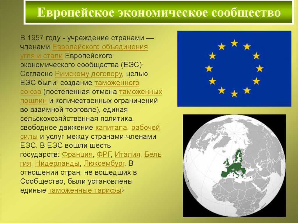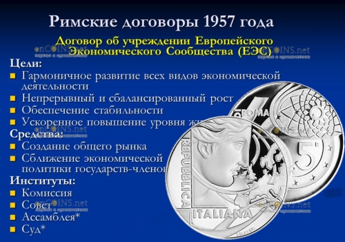 Вместе с тем цели, обозначенные в договоре, отражали характерную для того времени обеспокоенность ходом экономического развития. Задачу обеспечения устойчивого экономического роста в Европе пытались решить и в рамках Организации европейского экономического сотрудничества, и при помощи Сообщества угля и стали, и в ходе переговоров о создании Международной организации торговли (ITO), позже родивших «мышь» – Генеральное соглашение по тарифам и торговле. Но будущая ОЭСР, созданная для распределения американской финансовой помощи в рамках «плана Маршалла», изначально обладала ограниченными возможностями по стимулированию экономического роста в Европе, а действие соглашения о Сообществе угля и стали распространялось лишь на отдельные отрасли экономики.