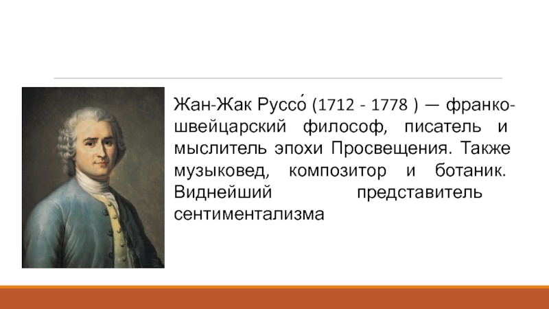 Жан Жак Руссо (1712–1778) — один из самых выдающихся мыслителей эпохи Просвещения. Своим страстным стремлением к изменению социального порядка, борьбой за научное мышление, всей своей разносторонней литературной деятельностью он, как и Вольтер, способствовал приближению революции во Франции. Вольтер и Руссо, по словам Г.