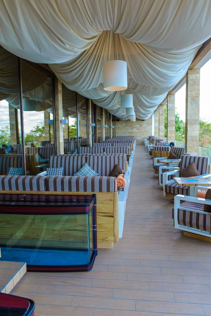 В распоряжении посетителей просторный основной и банкетный зал. В теплое время года работает открытая летняя терраса с прозрачными столами, мягкими креслами кушетками и подушками. Из ресторана гостям открывается живописный вид на Черноморское побережье.