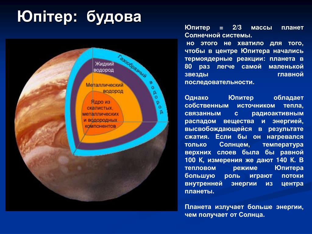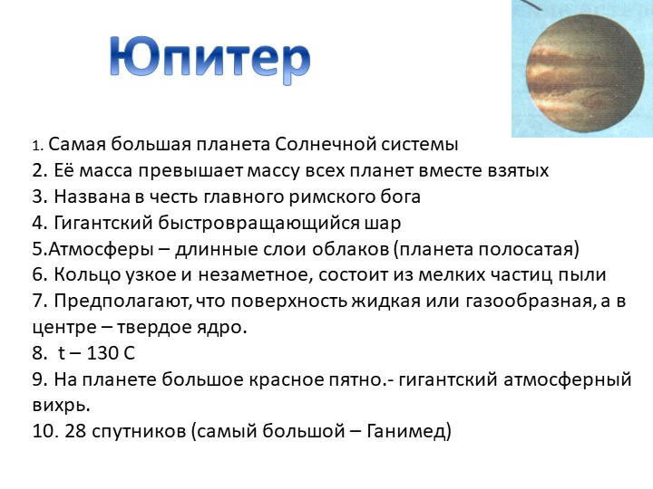 Самой большой планетой Солнечной системы и наиболее массивной из них является Юпитер. Его экваториальный диаметр равен 143884 км, что в 11,209 раз превышает диаметр Земли и составляет 0,103 диаметра Солнца. Форма Юпитера не совсем сферическая , поскольку планета состоит из газа и жидкости и быстро вращается. Полярный диаметр Юпитера равен 133708 км. По объему Юпитер эквивалентен 1319 объемам Земли. Масса Юпитера в 318 раз превышает массу Земли и в 2,5 раза больше массы всех остальных планет, вместе взятых. Для того, чтобы образовалась масса, равная массе Солнца, потребуется 1047 таких планет, как Юпитер.