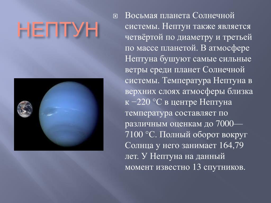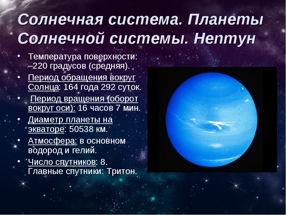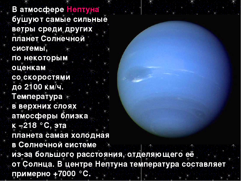 Средняя температура составляет около -214 градусов по Цельсию. Это намного холоднее, чем в среднем на Земле 15 градусов по Цельсию. У Нептуна нет твердой поверхности как таковой, а вместо нее есть слой ледяной воды, который служит мантией планеты.Это затрудняет определение температуры поверхности, но исследования, проведенные с Земли и с помощью полетов, позволили получить эту среднюю температуру из верхних слоев атмосферы.