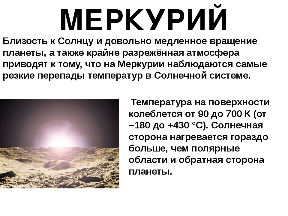 Интересно, что Меркурий, ближайшая к Солнцу планета, тоже бывает экстремально холодной. Если обращенная к Солнцу сторона Меркурия имеет температуру 400 °C, то на другой стороне она опускается до минус 200 °C. Причина таких температурных контрастов в том, что, в отличие от Земли, у Меркурия нет атмосферы, которая действует как одеяло, удерживая тепло и распространяя его вокруг.