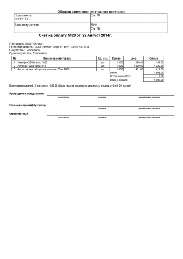 Результат – возможные претензии налоговиков, считающих, что, получив предоплату с НДС, поставщик должен уплатить налог в бюджет. В таком случае счет на оплату без НДС, наряду со счет-фактурой и накладной без указания налога, поможет вам отстоять вашу правоту в спорах с налоговой.
