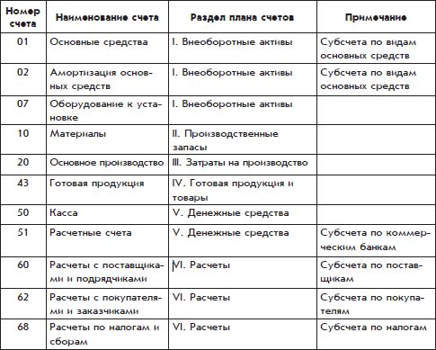 К основным активным счетам относятся: 01 “Основные средства”; 10 “Материалы”; 41 “Товары”; 50 “Касса”; 51 “Расчетный счет” и др.